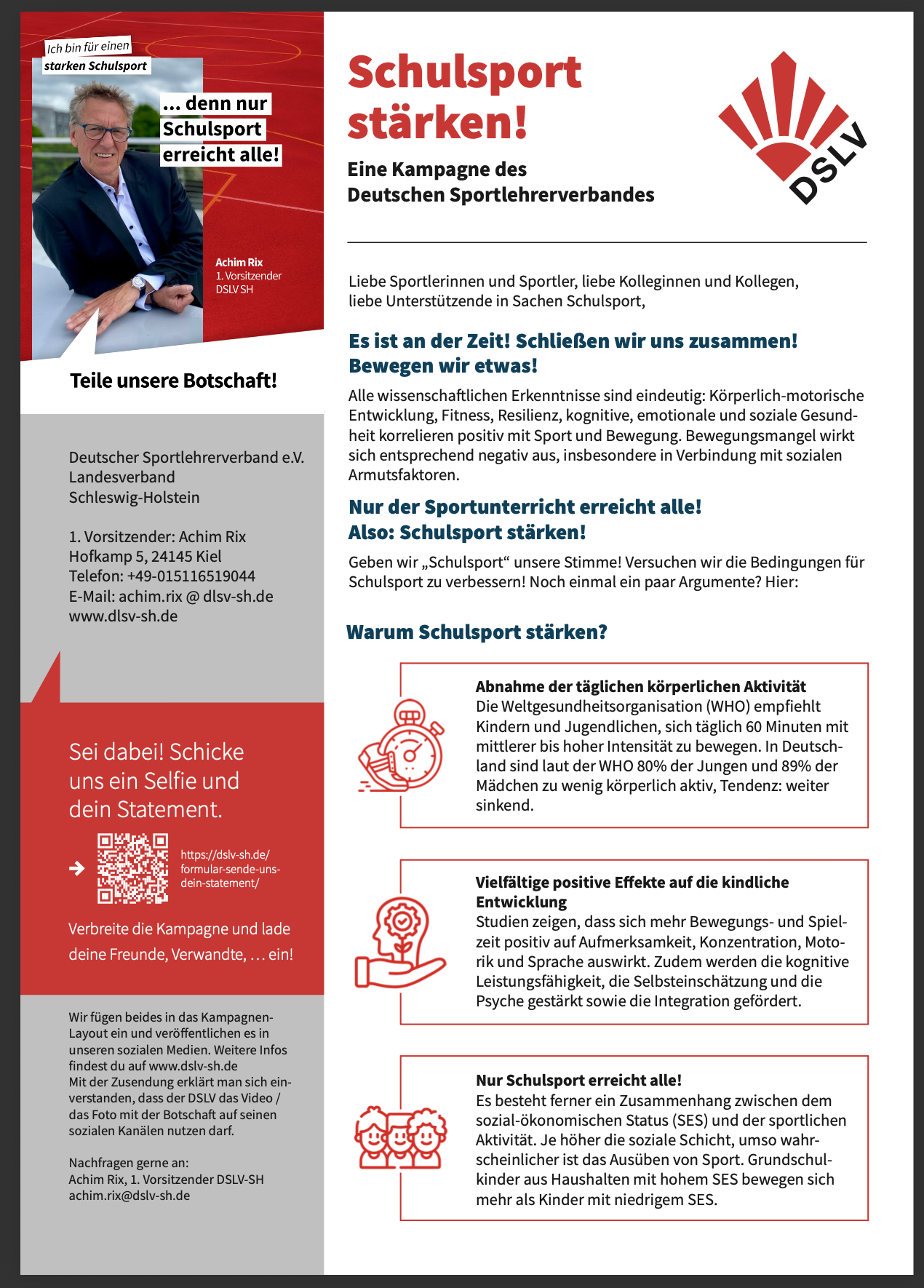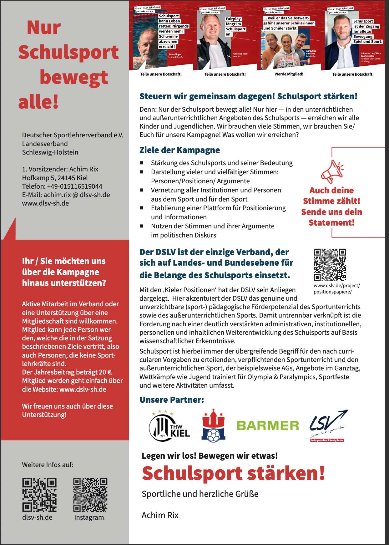 Ein Gesicht und ein Statement pro Schulsport werden auf der Website / sozialen Medien gepostet. Gesammelt machen Sie deutlich, wer hinter diesem Thema steht.