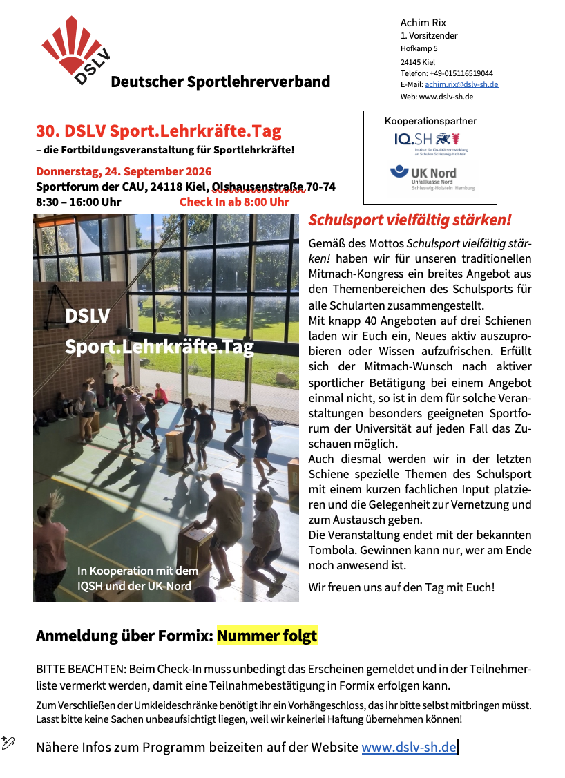 Jährlich im September organisiert der DSLV SH in Kooperation mit dem IQSH und der UK Nord den Sport.Lehrkräfte.Tag, die Fortbildungsveranstaltung für Sportlehrkräfte aller Schularten.